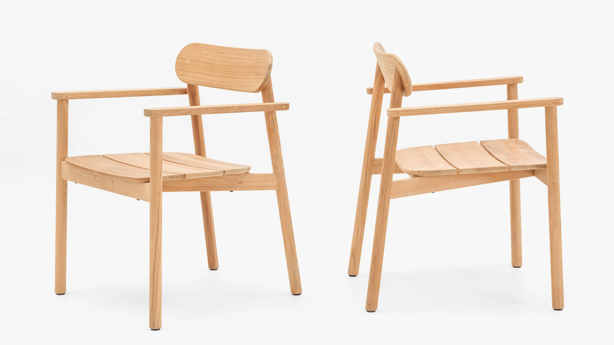 The stackable Freya chair has a classic and elegant appearance. Its solid wooden legs and curved backrest are gently rounded which creates an inviting yet sturdy look. Three wide teak slats characterize Freya's seat and give the chair a timeless aesthetic with an edge.